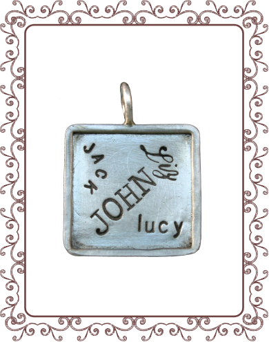 This beautiful charm is wonderful statement piece on its own or as an addition to a Collage Necklace! Forged from sterling silver with a hand formed, silver rim and stamped with your choice of personalization, the 7/8" silver rimmed square is shown here with a collage of names in various fonts. All of our charms include a basic design in the price. You may choose an initial, a monogram, one line of text up to 10-12 characters, or a design stamp. For an additional fee, you may choose to add up to 2 additional lines of text, a name "crossword", or have us design a unique collage layout from information you provide to us. You may add one of our tiny or small gold additions in your choice of 10K yellow, rose or green gold, and may add stamping to the back of the charm as well. Please feel free to contact us with any questions regarding charm design and layout. Visit our design gallery for more creative layout ideas. Personalize it and make it yours!