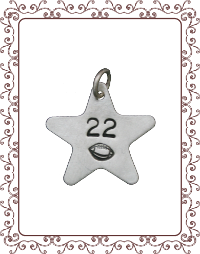 Our urban sweetpea large charms are sweet and whimsical! Approximately 7/8" wide and hand forged of sterling silver, our large star is shown here with a football design stamp and an additiona line of a team number above. All of our charms include a basic design as a part of the cost. You may choose an initial, a single line of text up to 4-6 tiny or small letters or numbers or a design stamp. For an additional design fee, you may also add an additional line of text or one of our tiny or small gold additions in your choice of 10k yellow, rose or green gold. Personalize it and make it yours!