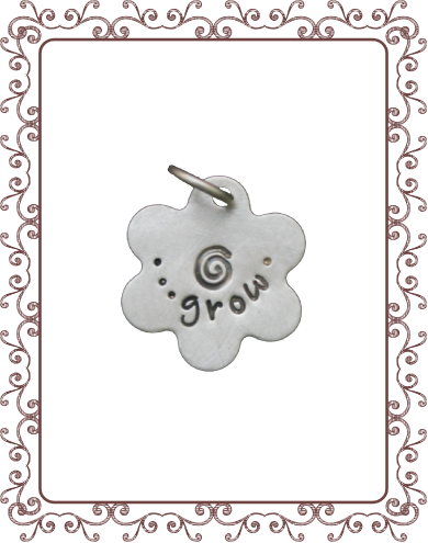 Our urban sweetpea medium charms are sweet and whimsical! Approximately 5/8" wide and hand forged of sterling silver, our medium flower is shown here with a centered design stamp, along with an additional line of text in our hand font. All of our charms include a basic design as a part of the cost. You may choose an initial, a single line of text up to 4-6 tiny or small letters or numbers or a design stamp. For an additional design fee, you may also add an additional line of text or one of our tiny or small gold additions in your choice of 10k yellow, rose or green gold.